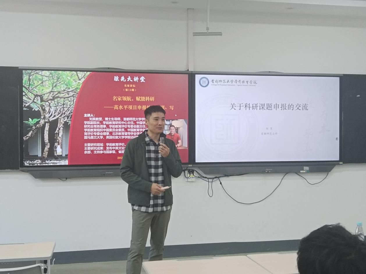 2025年1月9日上午,由琼台师范学院主办,学前教育学院承办的“琼先大讲堂·名家讲坛”第13期学术活动在府城校区茂琦楼308教室举行。首都师范大学学前教育学院副院长、博士生导师刘昊教授担任主讲,主题为“名家领航,赋能科研——高水平项目申报的策、谋、写”,学前教育学院全体教师及校内其他感兴趣的师生在教室集中参与学习。