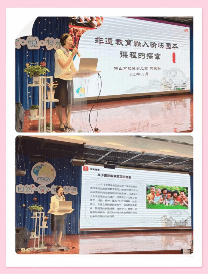 何珠和园长从缘·研究背景—融·园本课程—探·课程实践三个方面介绍了《非遗教育融入愉快园本课程的探索》。