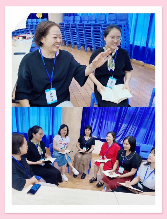 第四组成员就上午在佛山市机关幼儿园参访活动展开热烈谈论。一是环境创设有巧思,幼儿园充分利用自然地势挖掘教育景点,蜿蜒的戏水池既是孩子玩水的乐园也是园区的水系景点,为保护园树而专门修建的旋转楼梯,还有与种植区无缝衔接的小土坡、孩子们的梦想墙等,彰显着园所对历史的传承和自然的敬畏。二是活动组织有智慧,混龄户外游戏中老师们在投入地观察记录,关注孩子发展投放的攀爬网,水电工参与孩子的木工活动指导,园所里人人皆为老师,“悦”体育课程体现出生机盎然。三是课程建构有特色, 何珠园长分享《非遗教育融入愉快园本课程的探索》,将非遗教育精巧地融入园本课程,体现出园本课程的在地性。