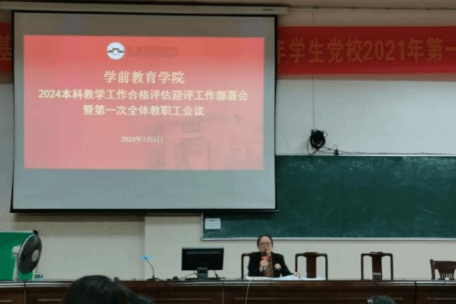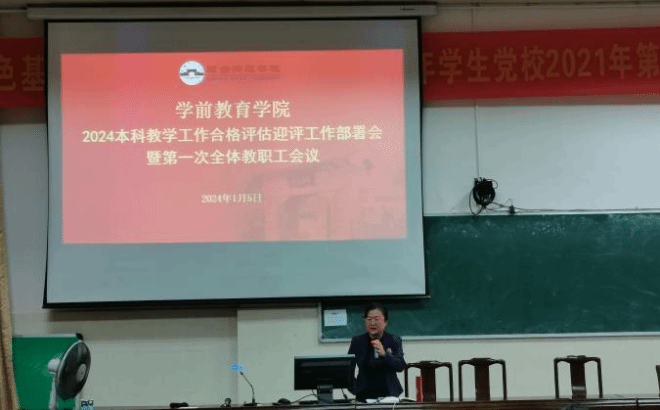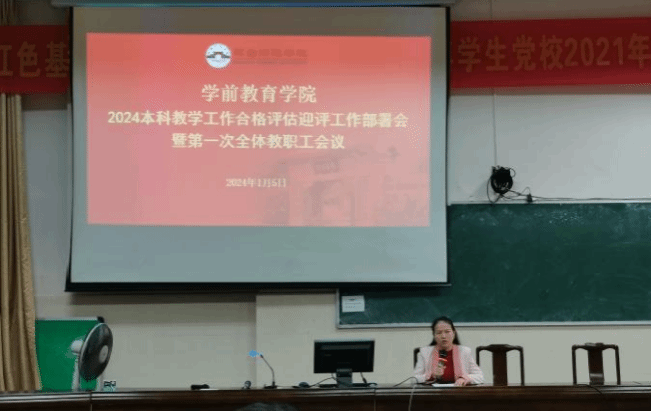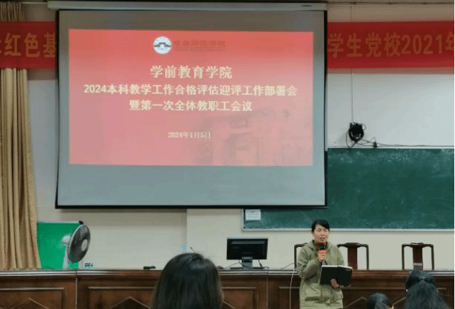 2024年1月5日上午,学前教育学院在科B101教室召开2024年本科教学工作合格评估迎评工作部署会暨第一次全体教职工会议。庄小满院长主持会议,学院领导班子、全体教职工参加会议。