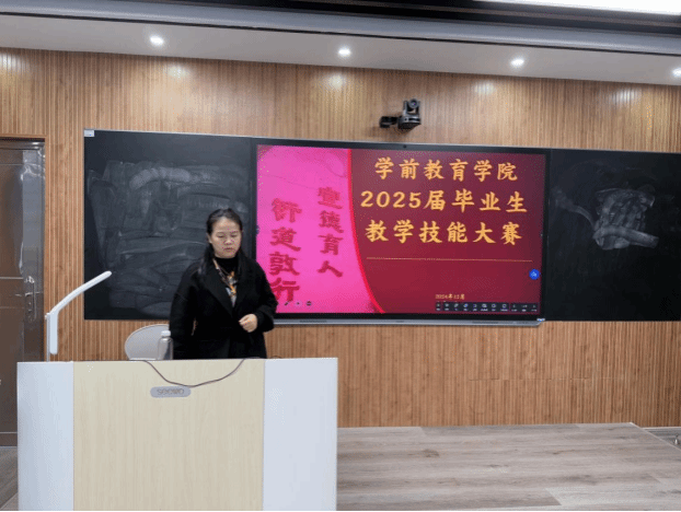 2025年12月25日下午2:30,琼台师范学院学前教育学院在府城校区图书馆201教室开展2025届毕业生教学技能大赛,旨在提升毕业生教学实践技能,提供展示专业技能的平台。在比赛开始之前,顾丽梅副院长向各位选手做了比赛流程及相关情况的介绍和说明。