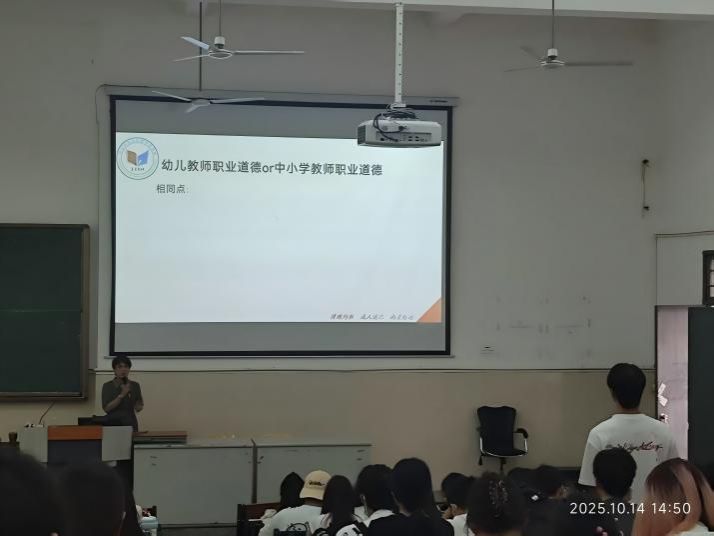 王老师首先引领同学们思考了幼儿教师与中小学教师职业道德的异同点,让同学们明确了幼儿教师的教育对象、教育内容和方法、职业角色和职责、职业道德规范侧重点均不同。在此基础上,王老师让同学们分享了自己的教育初心,从职业维度、法律维度对幼儿教师职业道德进行了解读,指出爱国守法、关爱幼儿、爱岗敬业、为人师表是幼儿教师职业道德的四大支柱。