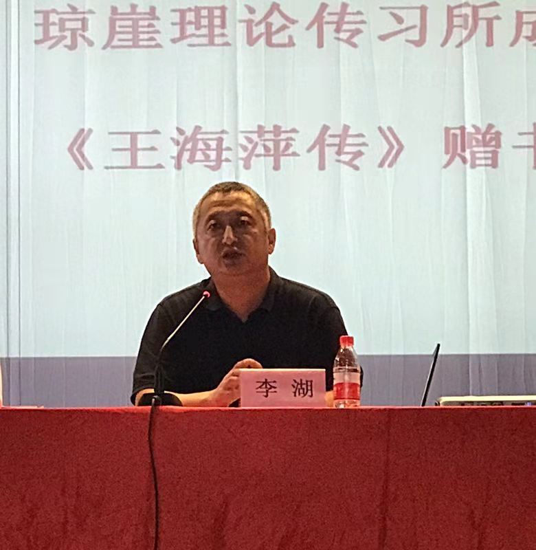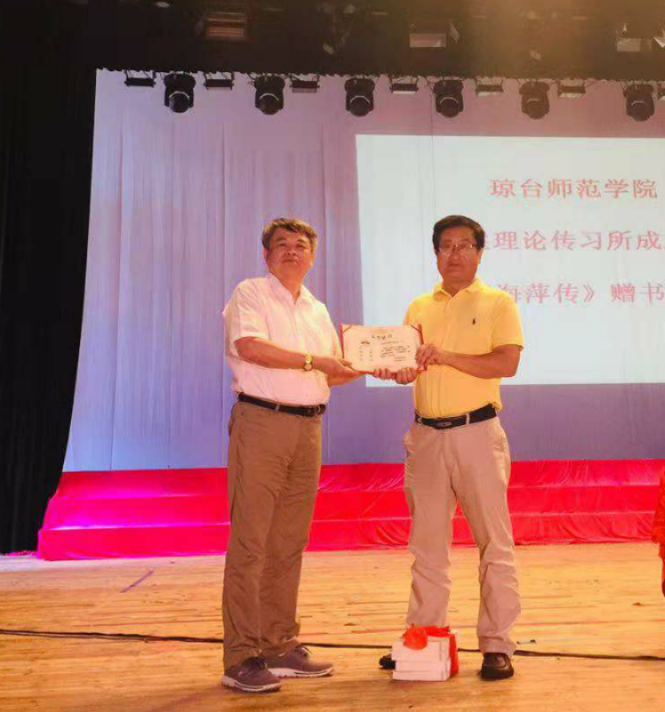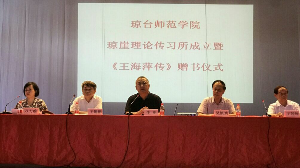 活动在热烈的掌声中进行。首先,由万力维副校长简单介绍了王海萍的生平及其跟琼台的渊源。紧接着,《王海萍传》作者王锡鹏先生将该书赠与了我校图书馆,李湖书记当场宣布琼崖理论研习所成立。