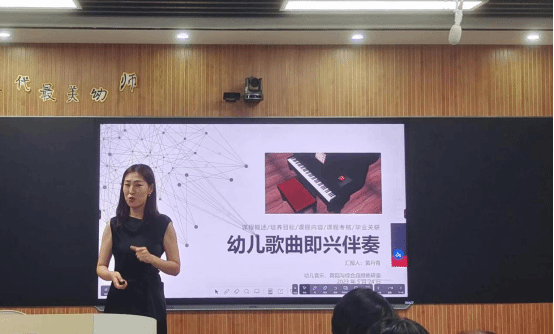 最后,黄丹青老师从课程概述、培养目标、课程内容、课程考核、和毕业关联五个部分,汇报了《幼儿歌曲即兴伴奏》的课程建设情况。该课程在设计时紧扣岗位能力要求,通过“钢琴演奏会”、“课堂弹唱展演”等考核方式,激发了学生练习钢琴弹奏的积极性,提升了幼儿歌曲弹唱能力以及可持续音乐学习和自主发展的能力,同时提升了学生音乐审美素养。