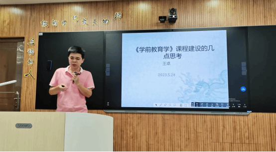 王卓老师就他讲授的《学前教育学》课程,首先,分析了该课程的基础核心地位,提出了“课程目标要与人才培养目标同向、同质、同构,并与课程自身的性质和功能相吻合”的设计理念;其次,依托“走近-走进-走出” 的认知过程,优化课程内容,突出课程内容的创新性、高阶性和实践性;再次,通过增加学生个人成长案例等过程性考核项目,激发学生的自我觉察,帮助学生理解课程理论的同时,反思并建立正确的教育观;最后,提出了“课程设计与教学中如何处理好前后课程的衔接而不重复”、“课程内容深度的把握”等建设问题。