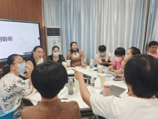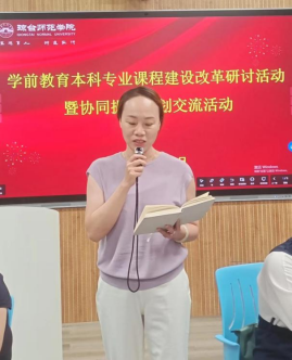 五位教师课程建设汇报结束后,各教研室围绕研讨会主题展开激烈讨论,并派教师代表分享思考与感悟。理论课程教研室主任邓红婵副教授强调理论课应该建设得更加生动有趣,考核方式需要创新,充分考核学生的应用能力。幼儿语言教育教研室主任巫秋云老师强调了语言能力是培养核心,要让学生有大量的文字阅读积累,并给学生提供表现和展示的机会。音乐与综合教育教研室主任赖竹婧副教授表示学生不仅要提升自己的艺术素养,会画、会跳、会唱,更重要的是学生要学会如何去教幼儿绘画、唱歌、舞蹈。美术与综合教育教研室主任欧阳娉婷老师希望学生的作品不仅能够在学院里呈现,还能够走进幼儿园,走入市场,打出品牌效应,并且要课上课下相结合,创造出更契合幼儿园活动的作品。