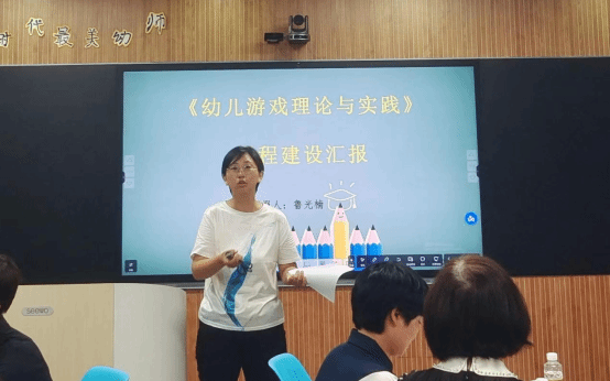 鲁光楠老师汇报《幼儿游戏理论与实践》课程建设的相关情况。从课程的基本情况、课程目标及内容、课程实施与毕业要求的对标情况、考核方式、后续的建设思路和问题等五个方面,阐述了这门课从初建到实施阶段的发展改革历程。着重介绍了“一体三梯次双循环”的教学模式,让学生将游戏理论知识与幼儿园实际开展的游戏结合起来。