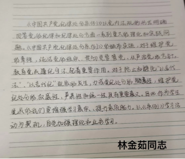 林金茹同志:《中国共产党纪律处分条例》以党内法规的形式明确回答党的纪律和纪律处分方面一系列重大的理论和实践问题。《中国共产党纪律处分条例》的颁布实施,对于维护党的章程,纯洁党的组织,贯彻党要管党、全面从严治党的方针,教育党员遵纪守法起着重要作用。对于防止和避免“以言代法”“以言代纪”现象的发生,力戒党纪处分的随意性,维护党纪处分的权威性、严肃性和统一性,具有重要意义。因此作为学生党员的我们要增强学习意识,提升素质能力。以《条例》学习活动为契机,自觉加强理论和业务学习。