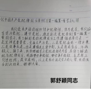郭舒颖同志:我们党有严格的组织性和纪律性,作为党员,我们应当学习党纪,遵守党纪。通过这次党纪条例第一章第一节的学习,我了解到党的纪律处分工作遵循的原则是:一是坚持党要管党、全面从严治党。二是党纪面前一律平等。三是实事求是。四是遵循民主集中制。五是惩前毖后,治病救人。接下来,我将继续学习党纪的相关内容,具体了解违纪与纪律处分,明确哪些事能做、哪些事不能做,在思想上划出红线、筑牢底线。