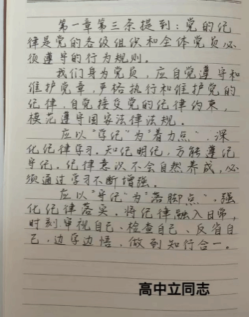 高中立同志:第一章第三条提到:党的纪律是党的各级组织和全体党员必须遵守的行为规则。我们身为党员,应自觉遵守和维护党章,严格执行和维护党的纪律,自觉接受党的纪律约束,模范遵守国家法律法规;我们应以“学纪”为“着力点”,深化纪律学习。知纪明纪,方能遵纪守纪。纪律意识不会自然养成,必须通过学习不断增强;我们应以“守纪”为“落脚点”,强化纪律落实。将纪律融入日常,时刻审视自己、检查自己、反省自己,边学边悟,做到知行合一。
