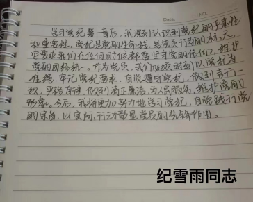 纪雪雨同志:学习党纪第一章后,我深刻认识到党纪的严肃性和重要性。党纪是党的生命线,是党员行为的标尺。它要求我们在任何时候都要坚守党的信仰,维护党的团结统一。作为党员,我们必须时刻以党纪为准绳,牢记党纪要求,自觉遵守党的纪律,做到言行一致,严格自律,做到清正廉洁,为人民服务,维护党的形象。今后,我将更加努力地学习党纪,自觉践行党的宗旨,以实际行动彰显党员的先锋模范作用。