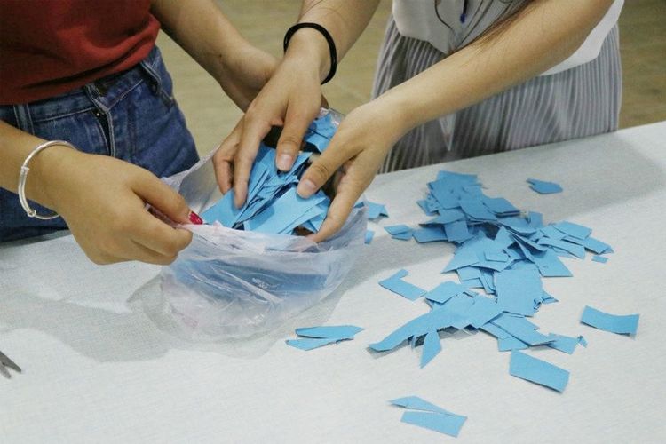 a 工作人员再给每位参与同学发两张长方形的纸片。主持人说明一张纸上写下自己的烦恼,另一张写下自己的快乐或以后的目标