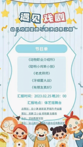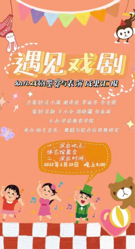 幼儿戏剧是一场润物细无声的美育,也是孩子们心灵安放的地方。为了加深学前教育专业的学生对幼儿戏剧的理解,实现自身综合能力的提升,2023年2月25日20点,学前教育学院在琼台师范学院府城校区体艺馆举办了“遇见戏剧”——幼儿戏剧鉴赏与表演成果汇报演出。本次演出由学前教育学院主办,幼儿音乐、舞蹈与综合应用教研室承办,学前教育学院庄小满院长、谢彦波党总支书记、罗丽丹副院长、乔金霞副院长担任总策划,吴静、王小金、郑晓瀛、包春雨老师合作策划。学前教育学院党总支书记谢彦波亲临现场观看,吴静、王小金、郑晓瀛、马晓铭等老师到场观看并在结束后进行了点评和指导。
