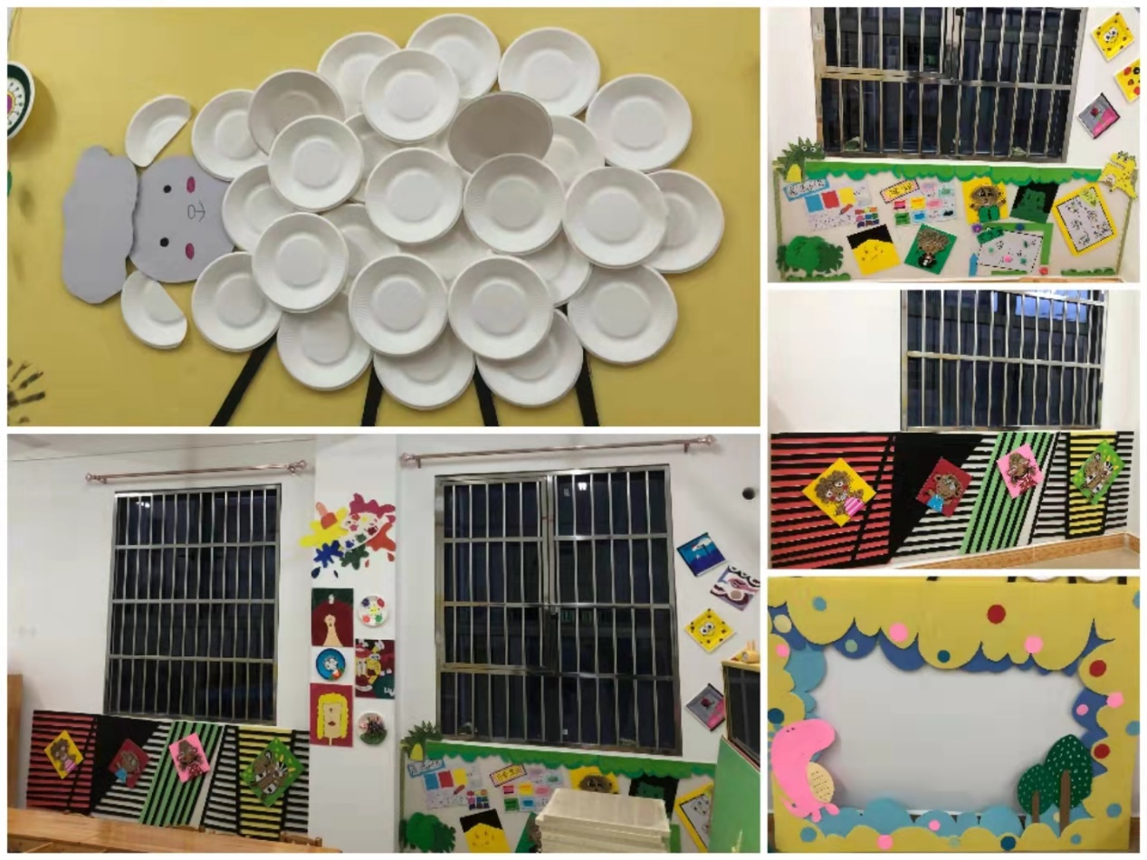此次帮扶工作得到了学校以及幼儿园的大力支持,幼儿园教师为我们准备好各种材料,在符英姿园长的组织下,同学们开始投入工作状态。在环创过程中,同学们就区域划分、材料投放、作品呈现与园里教师进行互相交流探讨,共同商议环创方案,并一起动手进行环创工作